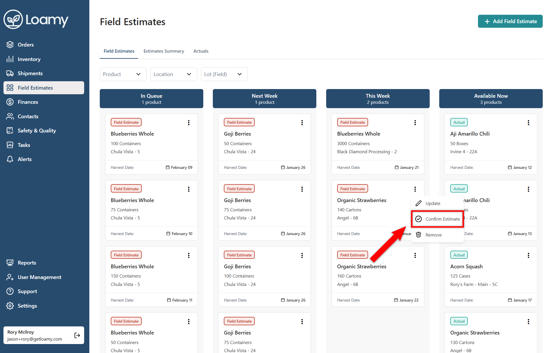 3. Find the estimate you want to confirm that has a harvest of this week and select the three dots.