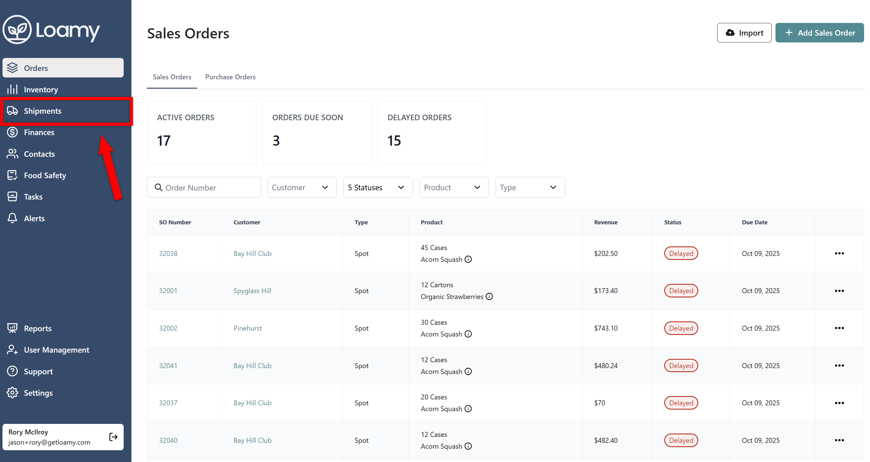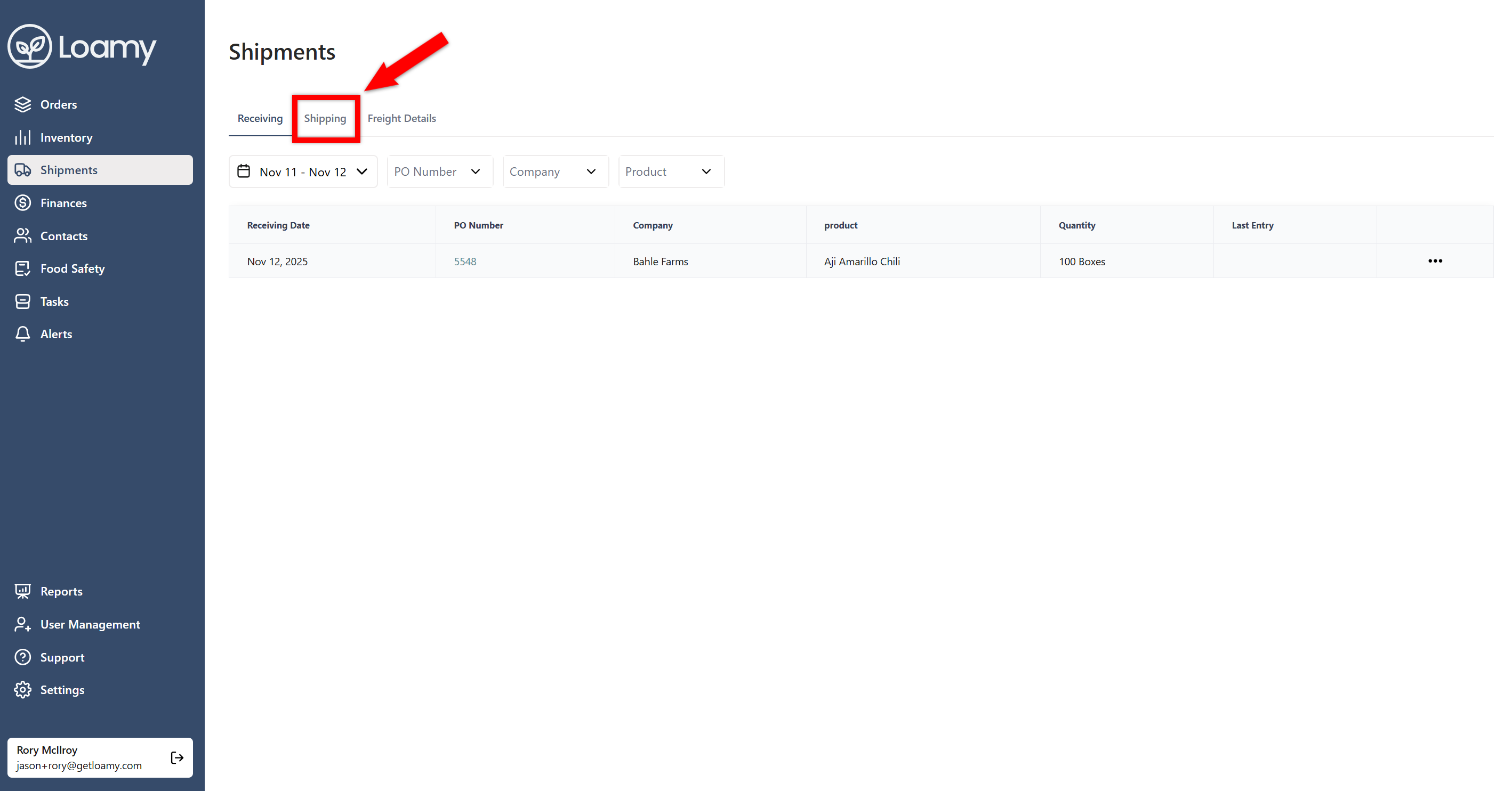 2. Go to the Shipments page by selecting it on the left-hand navigation menu.