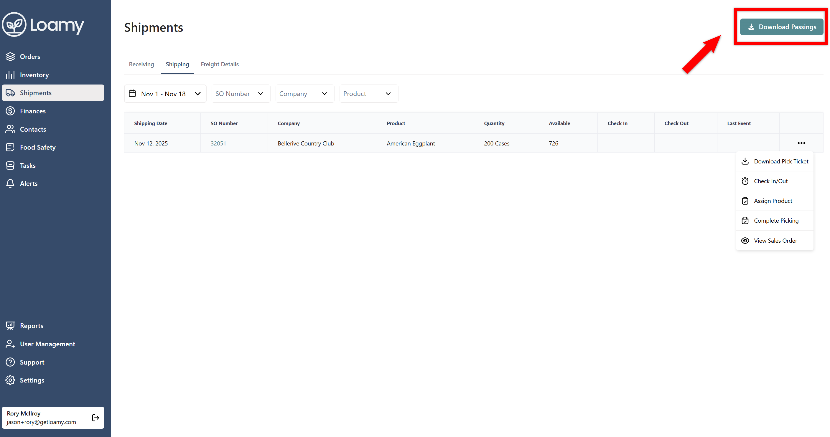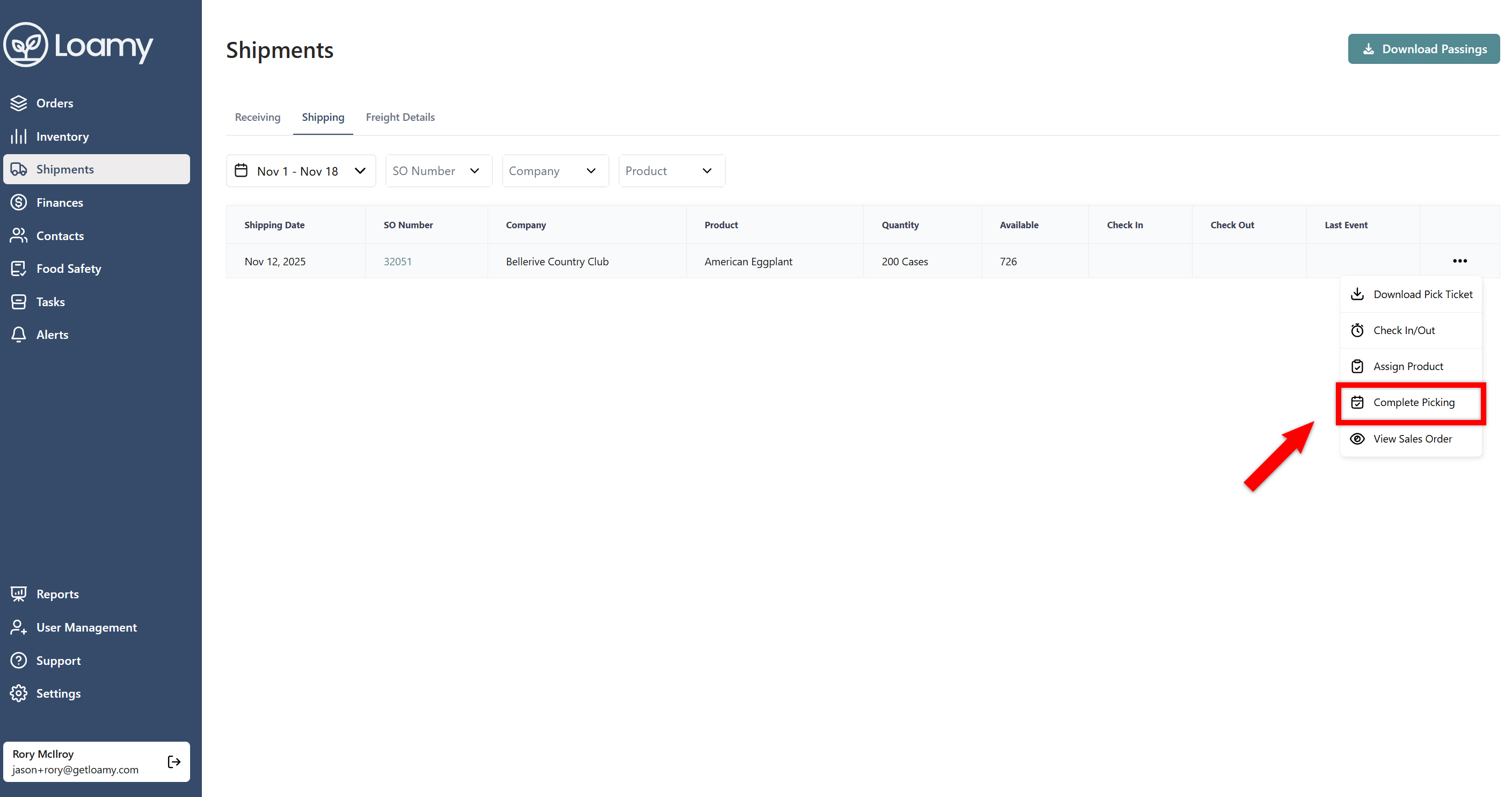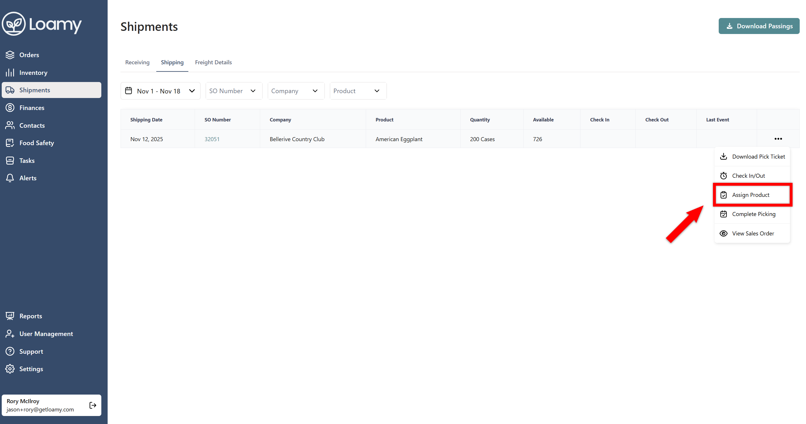 6. Then go back to the three dot menu and select Assign Product. Note: You can download the pick ticket from here as well if you wish to do so ahead of time.