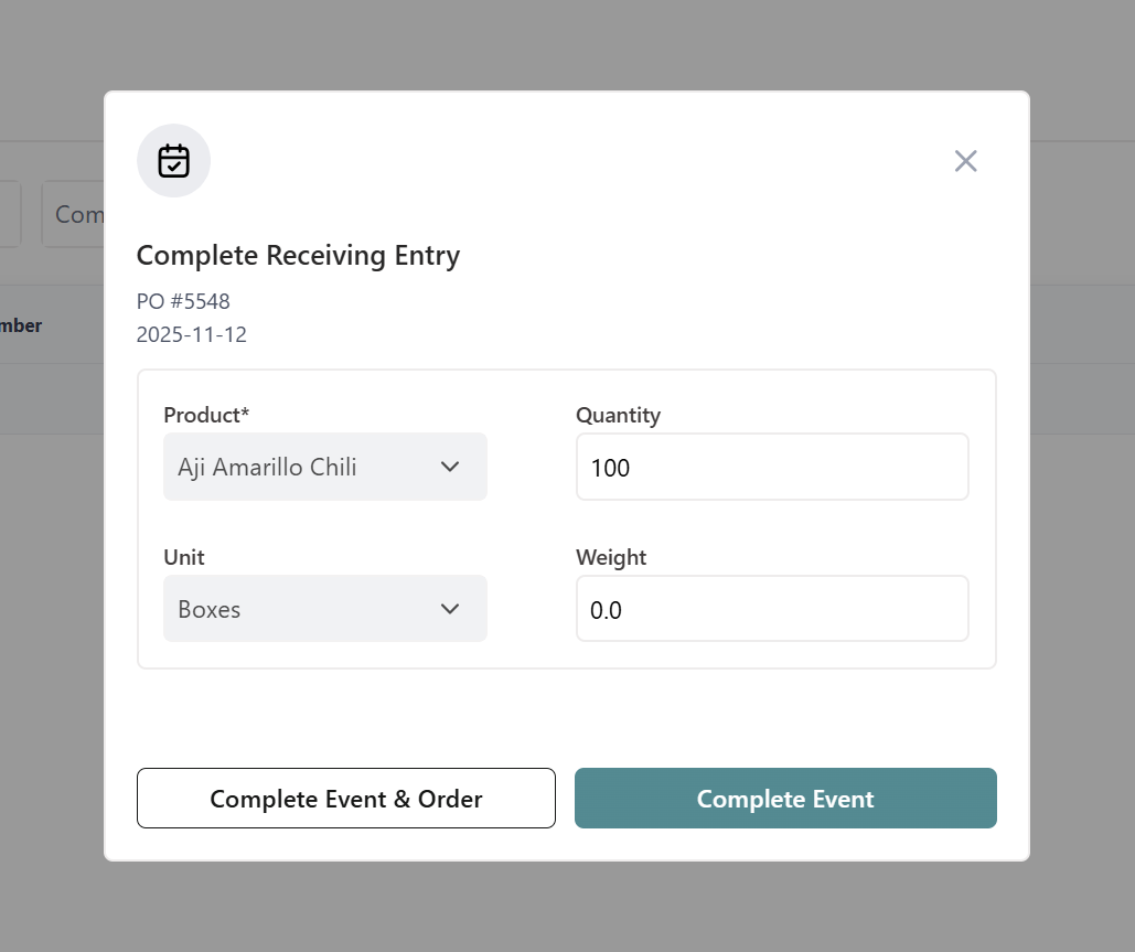 4. Confirm the quantity and weight of the product. You can then select Complete Event or Complete Event & Order if you wish to mark the purchase order as completed as well.
